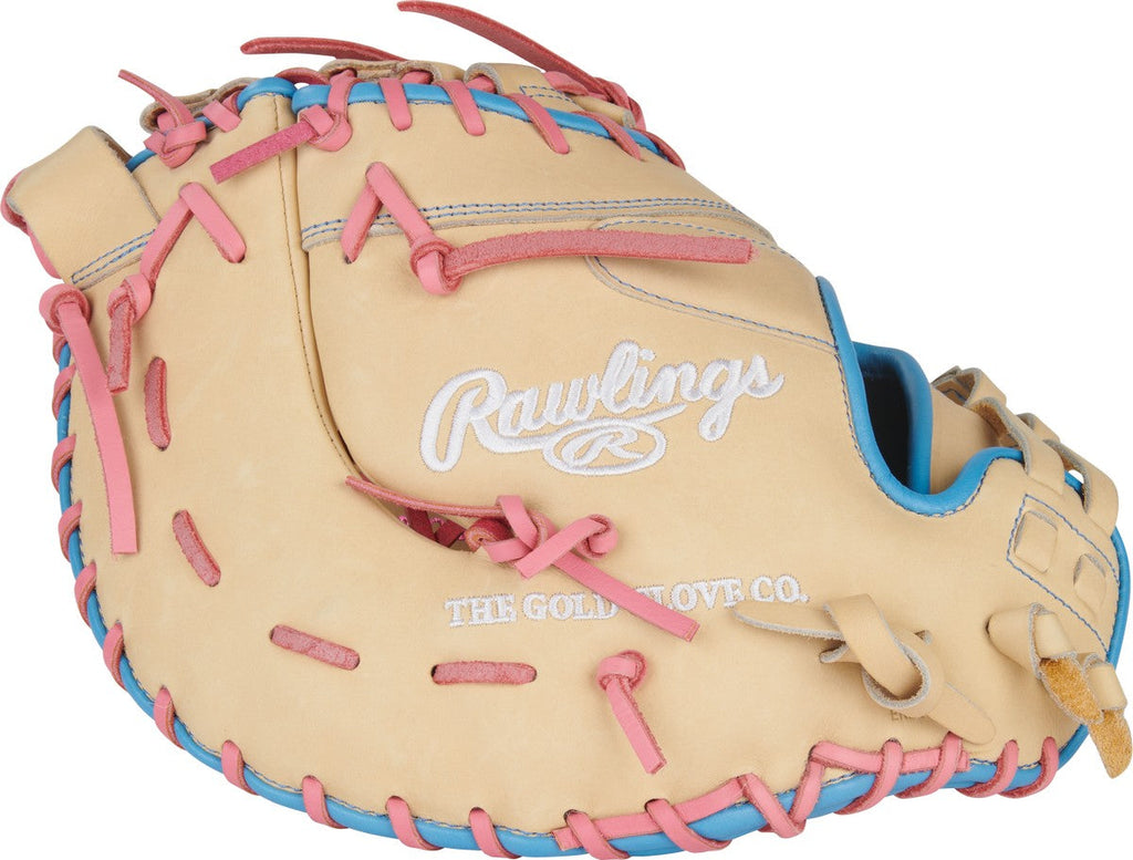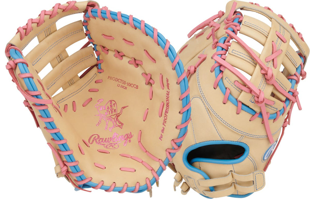 Anchor your infield with the Rawlings Heart of the Hide 13-Inch First Base Softball Glove. Designed for elite softball players, this glove features a Single Post Double Bar Web that creates a deep, secure pocket for handling tough hops and scooping low throws with ease. Built from pro-grade steerhide leather, this glove offers the same durability and performance trusted by the game's best. The eye-catching Camel/Pink/Columbia Blue colorway adds flair to your defense, while the padded thumb sleeve enhances comfort and support through every stretch. Make every play at first look easy. Get the Rawlings Heart of the Hide 13-Inch First Base Softball Glove today.