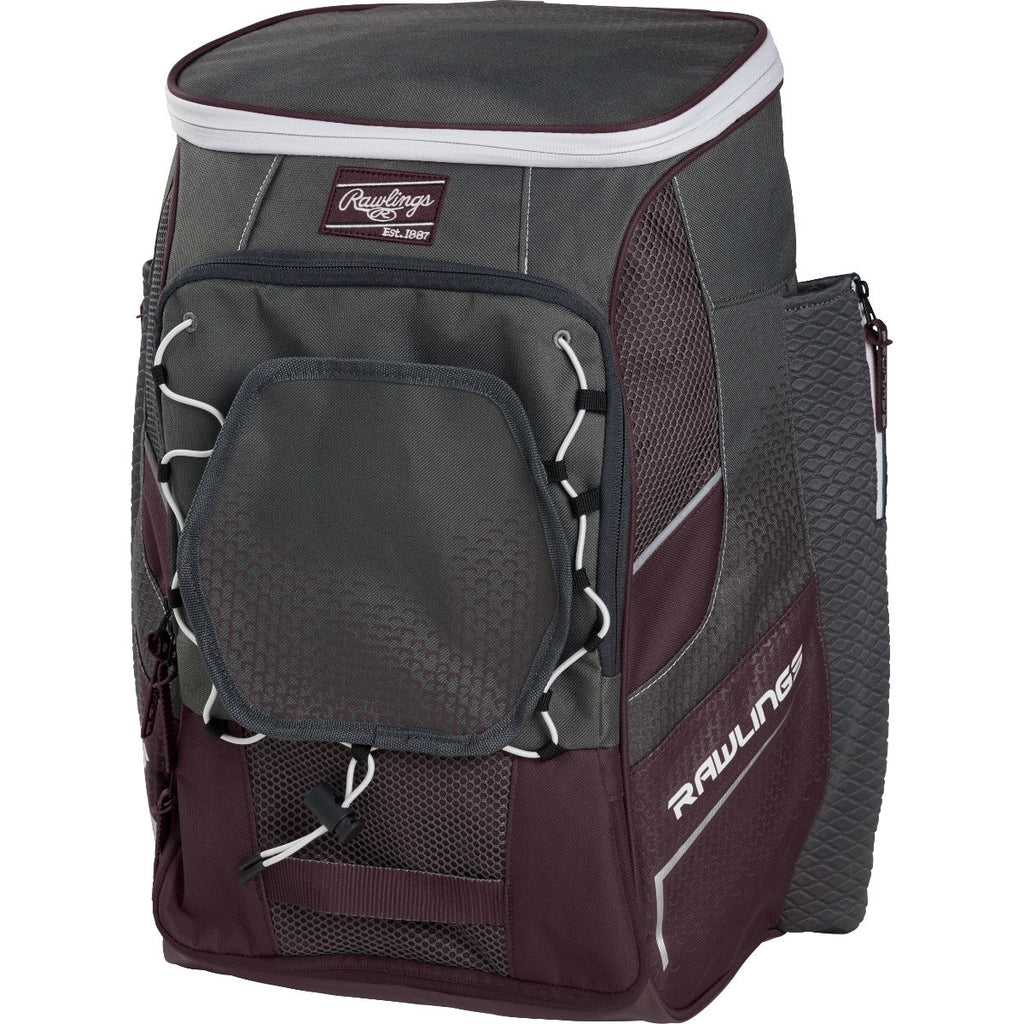 Rawlings Impulse Backpack. 19.75? H x 13.2? W x 9.8? D, 45 liters. Two (2) neoprene bat storage locations. Customizable top valet tray and MARK OF A PRO valuables compartment. Two (2) removable custom team decoration locations (valet tray and beaver tail). Main storage compartment converts to game time shelf for easy access to gear. Internal cleat/turf storage compartment. Fully structured & easy to clean tarpaulin bottom material. Includes fence hook.