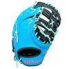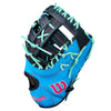 The Wilson A2000 1677 SuperSkin 12.5" First Base Glove is expertly crafted for first basemen seeking top-tier performance and style. Featuring a striking colorway of sky blue, navy, and mint, this glove boasts a 1677 pattern with a single post web design, ensuring optimal ball control and visibility. The Pro Stock Leather construction, coupled with SuperSkin backing, offers unmatched durability, being twice as strong as regular leather while maintaining a lightweight feel. Enhanced with a Dri-Lex wrist lining for superior breathability and moisture management, this glove also includes flat finger binding for added comfort and rolled dual welting to retain its shape over time.